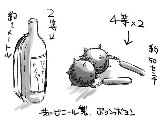 くじ引きで姉が当てたのは、2等賞の瓶・・・、ちんぶら'ズが当てたのは、何でかそろって4等賞のトゲ鉄球。 超いらねえwww