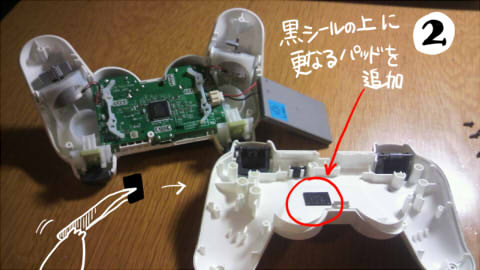 よくよく考えてみたら、接点に対して上から(イヤ正確には下からなんだが)圧力を加えりゃいいのかと気づき、薄い厚みのある黒シートを、ガワにあるパッド部分に貼りました。