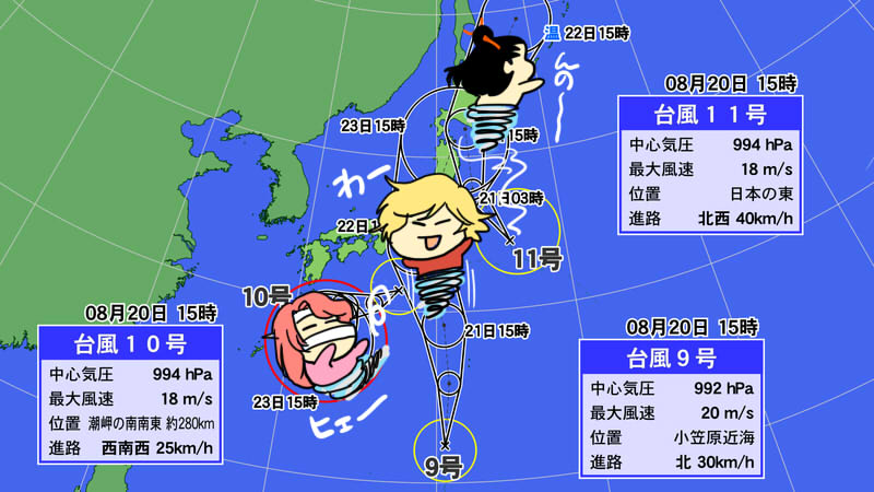 3個の台風がてんでバラバラに勝手な方向へと進んでる、まるで校庭に放たれた小学生男子の様な動きwww