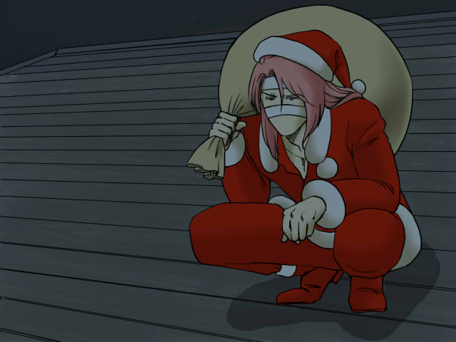 色々あって成り行き上サンタさんやる事になったボガンさんは屋根の上で途方に暮れております。パーティーに行くはずだったのに何でこんな事に…と、一瞬サボろうか考えているんだけど、ヒョゴさん絡みか鉄壁の監視網で誤魔化す事が出来ないのが分かってて遠い目になってるとかな。